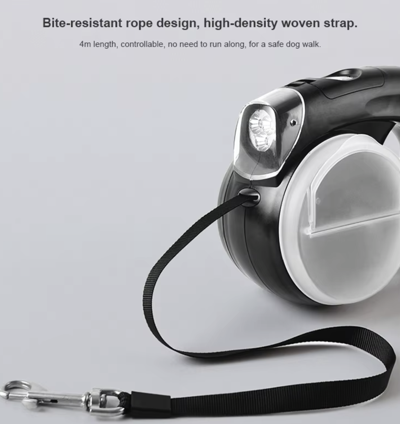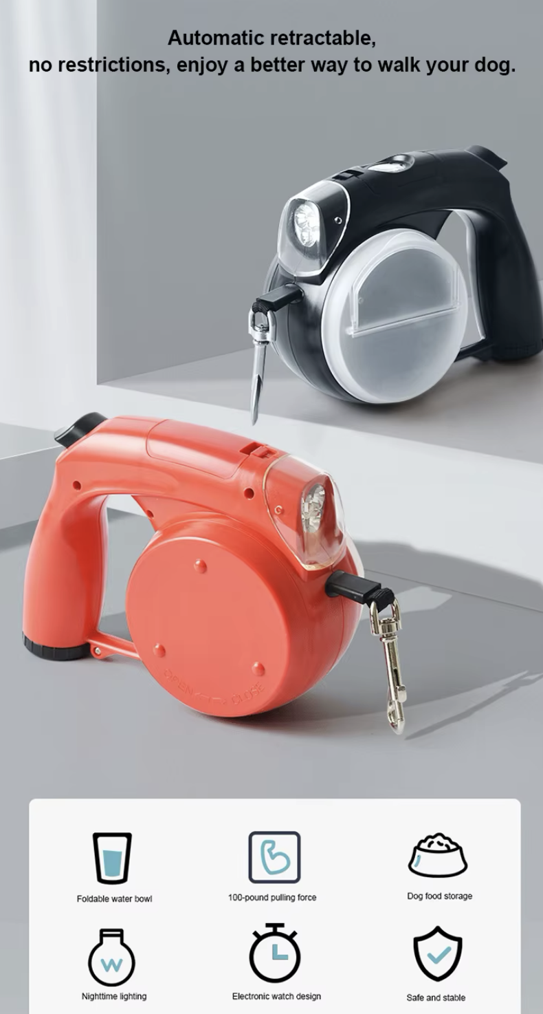 Todo lo que tu perro necesita en una sola correa 🐾💡 ¡Luz, bolsitas, snacks y hasta su plato portátil! #PaseosInteligentes